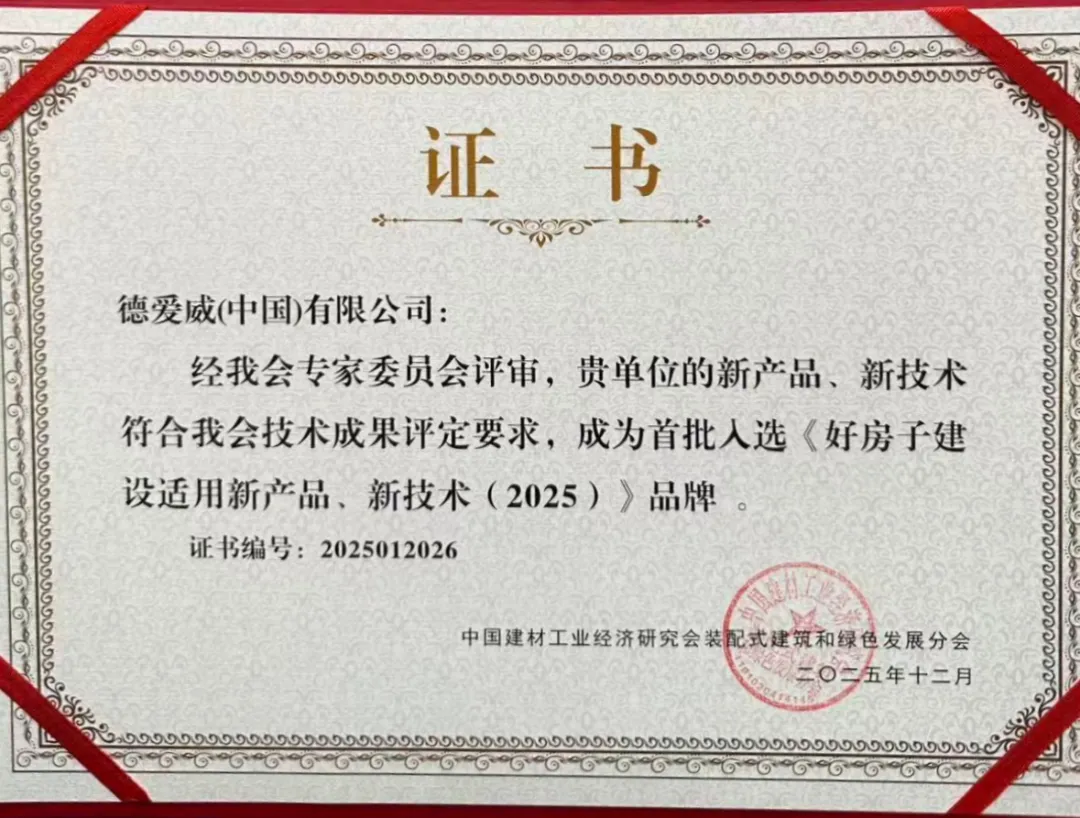 CAPAROL 《好房子建设适用新产品、新技术(2025)》品牌 2025年好房子、好材料生态发展大会暨中国建材工业经济研究会装配式建筑和绿色发展分会年会 首批入选 —— 12月12日,在中国建材工业经济研究会装配式建筑和绿色发展分会主办的“2025年好房子、好材料生态发展大会暨中国建材工业经济研究会装配式建筑和绿色发展分会年会”上,德爱威(中国)有限公司凭借低碳环保、绿色科技的涂装解决方案,以及在城市更新等领域的广泛应用,从众多品牌中脱颖而出,荣获“首批入选《好房子建设适用新产品、新技术(2025)》品牌“! 本届大会以“共创共营 启航同行”为主题,汇聚了行业协会领导、涂料产业链专家等数百位行业精英,共同探讨“好房子”背景下的涂料行业新机遇。这一殊荣不仅是对德爱威深耕建筑涂料领域的高度认可,更彰显了其在赋能高品质人居环境中的标杆地位。 德爱威的“好房子”答卷: 科技赋能,绿色同行 “好房子”建设要用“好材料”。德爱威的百年基因里,本就藏着与“好房子”同频的密码。作为从德国百年品牌里生长出来的涂料企业,在“好房子”政策按下启动键之前,德爱威早已扎根中国市场,结合德国技术沉淀与本地市场需求,最终打磨出五大核心建筑场景的涂装解决方案。 开发商选起来更放心:德爱威绿色建材背书是“安心符”。减少墙面问题投诉,低维护成本拉低综合支出,环保耐久品质更能为项目增值添竞争力。 施工方用起来更省心:易施工(一涂即匀)、省材料(省10-15%)、快干省工期,全程技术指导+绿色认证齐全,交付验收更顺畅。 住户住进去更踏实:德爱威涂料是“会呼吸的健康守护者”,符合“好房子”安全标准;耐久品质让墙面常新,住得踏实有幸福感。 荣誉加身初心不改 当“好房子”从政策倡导变为市场共识,德爱威早已走在前面,第一时间响应国家政策,积极参与 “好房子涂料标准”的构建,让“安全、舒适、绿色、智慧”从文件落地为每一面墙。 此次获奖是德爱威发展历程中的重要里程碑,也是新征程的起点。德爱威将以荣誉为动力,持续践行“品质、创新、可持续”的理念,与行业伙伴共行,用优质涂装解决方案描绘美好生活的底色,为“好房子”建设贡献更多德爱威力量! |